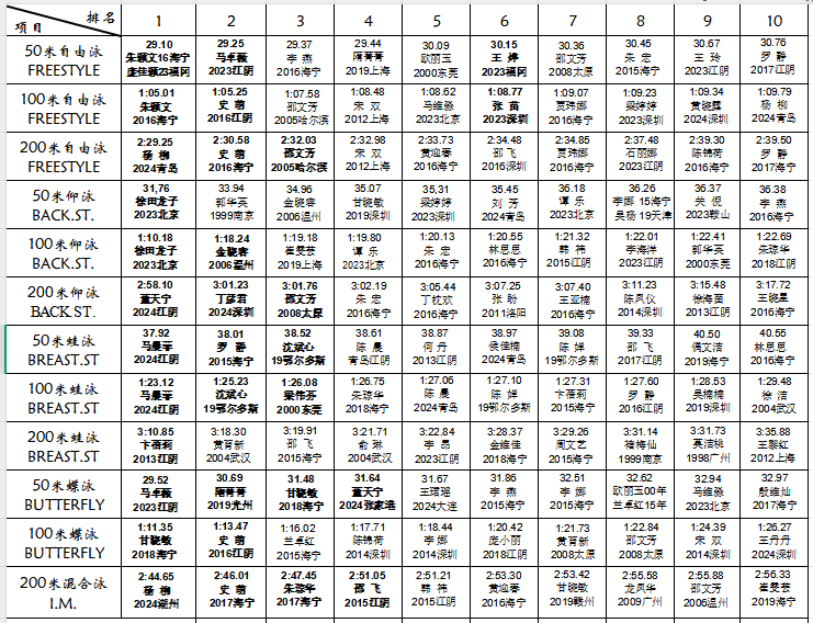 Top 10 National Adult Swimming Rankings (Men) for 2024
