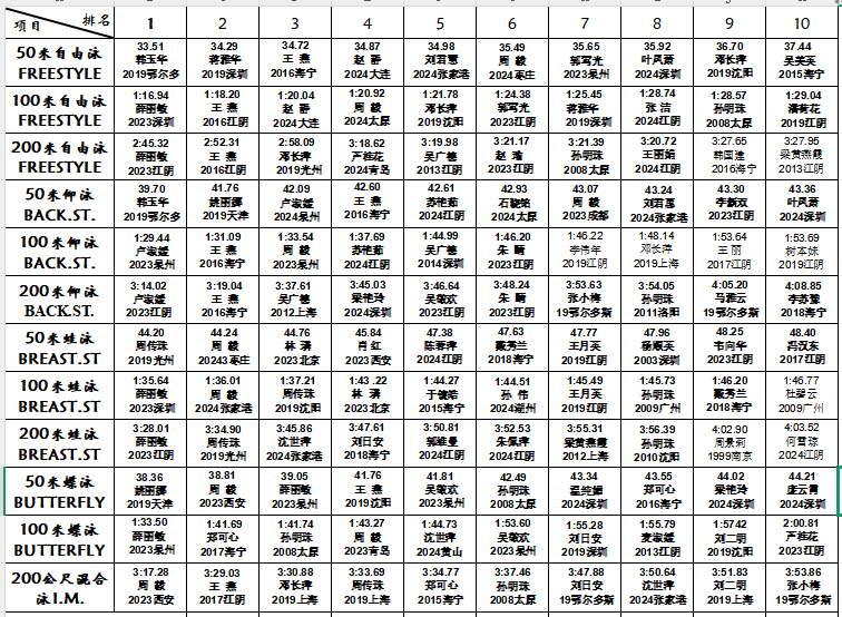 Top 10 National Adult Swimming Rankings (Women) for 2024