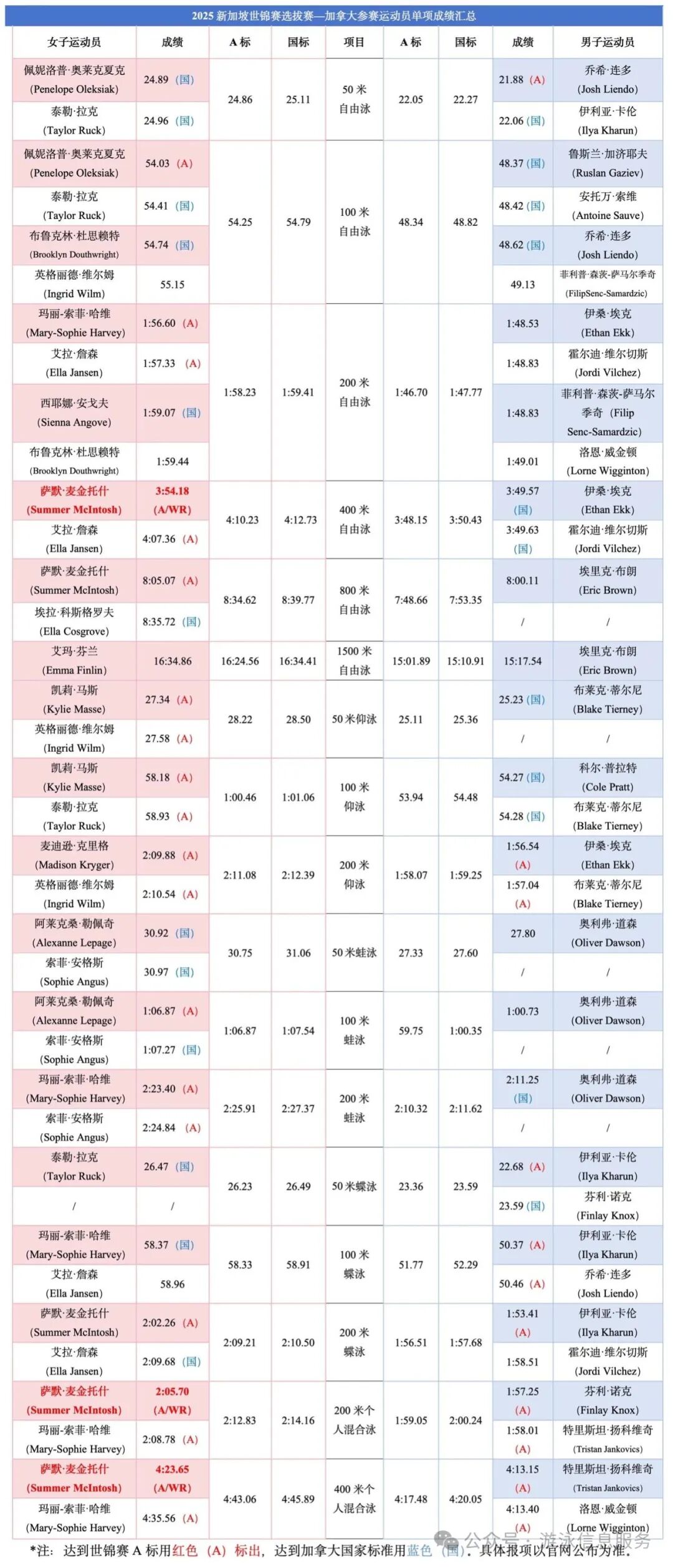 Finally, if no athlete in the individual event finals (Group A) meets the World Championships A standard, the fastest-performing athlete from Group A who also meets Canada’s national qualifying time will be chosen for the relay team.Canada's Athlete Roster for the 2025 Singapore World Championships