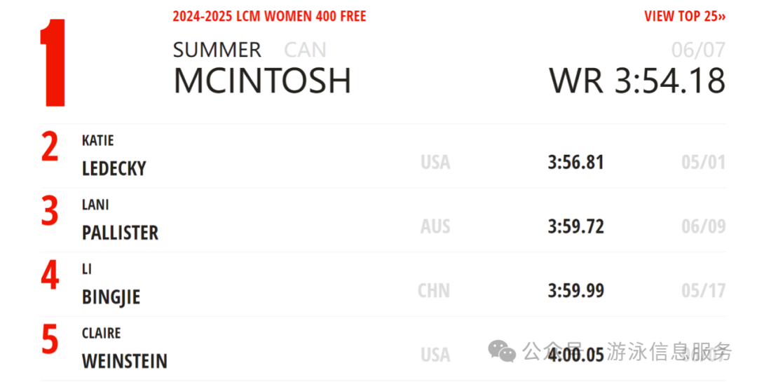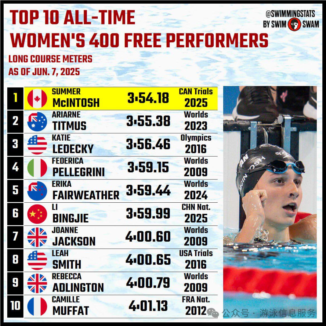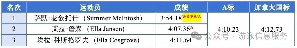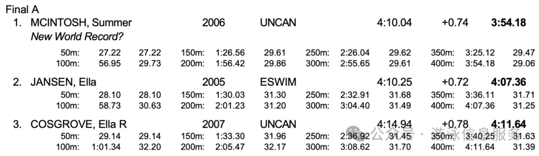 In the women's 400m freestyle final, Paris Olympics three-time gold medalist Summer McIntosh finished ahead of her competitors.Nearly a 14-second leadWinning the championship in this event (3:54.18),Breaking the record previously held by Australian star Ariarne TitmusCreated in 2023World record(3:55.38), while also setting a new personal bestPersonal best performance(3:56.08). Ella Jansen finished second in the final with a time of 4:07.36, while Ella Cosgrove claimed third place, clocking in at 4:11.64.Summer McIntosh and Ella Jansen have both met the A-standard for the women’s 400m freestyle event at the 2025 World Championships in Singapore.Top three finishers' split times in the women's 400m freestyleSummer McIntosh's 400m Freestyle Personal Best Split Times Compared(Quoted from SwimSwam, June 13)(World rankings for the 2024-2025 season, sourced from SwimSwam, as of June 13)