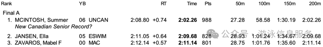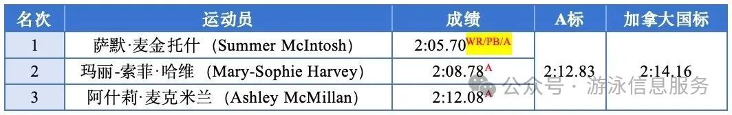 In the women's 200-meter individual medley final, Summer McIntoshWith a time of 2:05.70, she broke the world record of 2:06.12, previously held by Hungarian star Katinka Hosszú., becoming the first in the project's historyThe first to break the 2:06.00 barrierThe female athletes: Mary-Sophie Harvey finished second in the final with a time of 2:08.78, while Ashley McMillan claimed third place, clocking in at 2:12.08.Summer McIntosh, Mary-Sophie Harvey, and Ashley McMillan have all met the A-cut standard for the women’s 200m individual medley at the 2025 World Championships in Singapore.Top three split times for the women's 200m individual medleySummer McIntosh's 200m individual medley performance compared to the previous world record split times(Quoted from SwimSwam, June 13)(World rankings for the 2024-2025 season, sourced from SwimSwam, as of June 13)