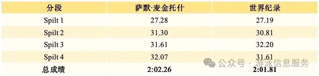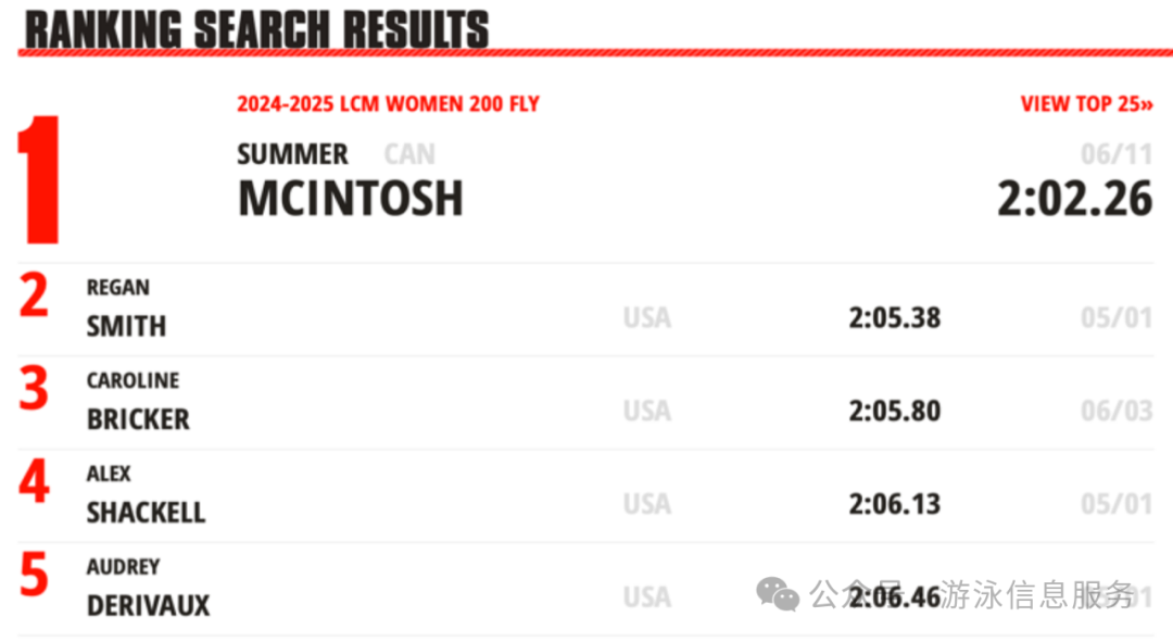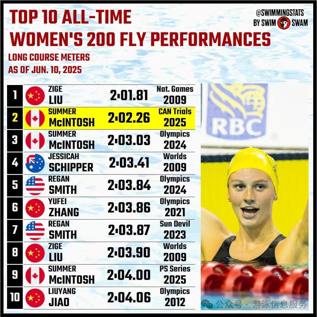 In the women's 200m individual butterfly final, Summer McIntosh claimed the gold medal, finishing with2:02.26The result surpassed the athlete's previous personal best of 2:03.03, set at the 2024 Paris Olympics, andBreakthat he/she had set for this projectCanadian RecordThis result is close toChinese athlete Liu ZigeMaintainedWorld record slower by 0.45 seconds, Ranking HistorySecond-fastest timeElla Jansen finished second with a time of 2:09.68, while Mabel Zavaros took third place, clocking in at 2:11.14.Summer McIntosh achieved the qualifying time for the women’s 200m butterfly A-standard at the 2025 World Championships in Singapore, ranking among the top performances of the current season (2024-2025).World No. 1Top three split times for the women's 200m butterflySummer McIntosh's performance compared to the world record split times(Quoted from SwimSwam, June 13)(World rankings for the 2024-2025 season, sourced from SwimSwam, as of June 13)