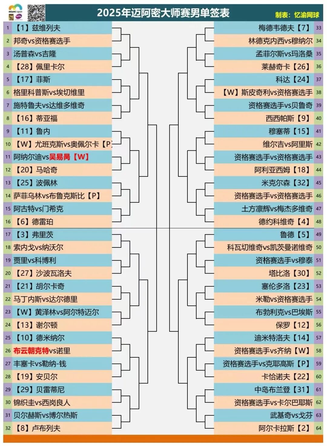 Draper is in excellent form—his impressive performance at Indian Wells has firmly established his credentials. For Zverev to advance smoothly, he’ll need to deliver his absolute best. Meanwhile, China’s rising star Wu Yibing also finds himself in this same half of the draw, set to face Italy’s promising youngster Arnaldi in the first round. After a six-month absence from competition, Wu’s current fitness remains uncertain, but his relentless fighting spirit should not be underestimated. This match is definitely one that all Chinese fans can look forward to!