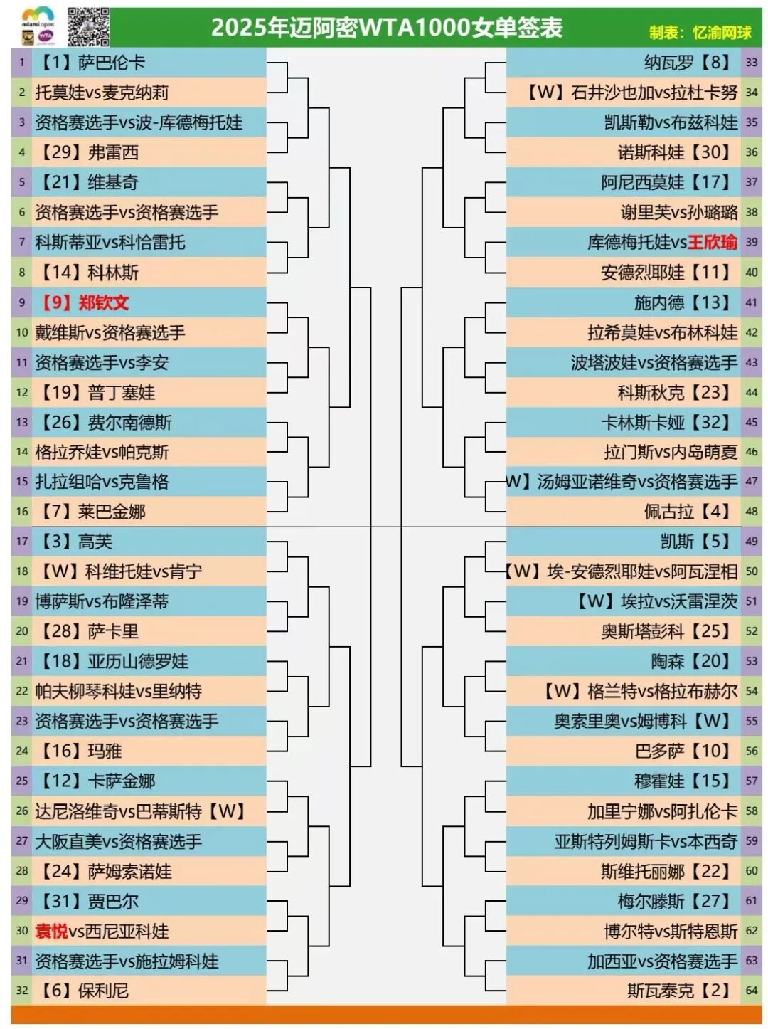 Her quarterfinal matchup will be against two-time tournament runner-up Rybakina—should the two face off, it’s bound to be a clash of raw power and precision. Chinese player Zheng Qinwen also finds herself in this half of the draw; as the No. 9 seed, she could encounter tough opponents back-to-back starting from the fourth round. With her formidable skills and immense potential, every match Zheng plays is already drawing intense attention.