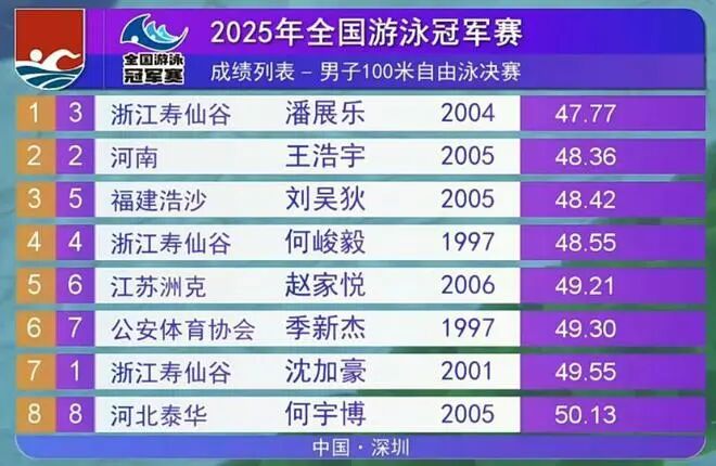 In the men's 100m freestyle final, Pan Zhanle, the world record holder (46.40) and representing Zhejiang, effortlessly clinched the gold medal with a time of 47.77 seconds—becoming the only swimmer to meet the World Championships A standard (48.34). This victory also marks Pan Zhanle's fifth gold medal at this year's championships.