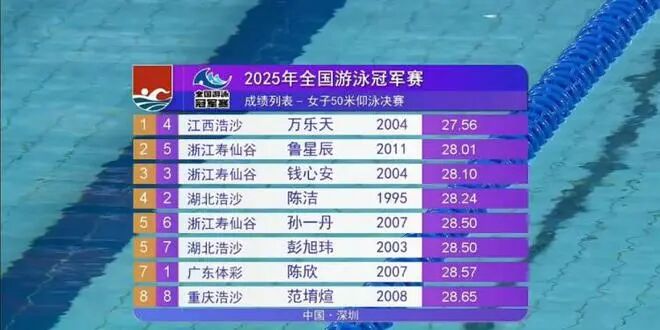In the women's 50m backstroke final, Wan Letian swam a time of 27.56 seconds to claim the gold medal. Meanwhile, 14-year-old Lu Xingchen from Zhejiang finished second with 28.01 seconds, and Qian Xin'an took bronze in 28.10 seconds. All three swimmers achieved the World Championships A-standard time.