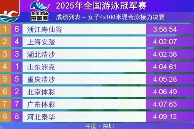 In the men's 4x100m medley relay final, the Zhejiang team—consisting of Xu JiaYu, Dong Yifan, Shen Jiahao, and Pan Zhanle—claimed victory with a time of 3:34.66. The Hubei team finished second in 3:36.39, while Shandong took home the bronze medal with a time of 3:36.71. This also marks Pan Zhanle's ninth gold medal of the tournament.
