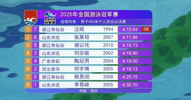 On Day 8 of the 2025 National Swimming Championships: Wang Shun breaks the meet record in the 400m individual medley, while Yu Zidi claims the gold; Pan Zhanle secures his 9th gold medal.