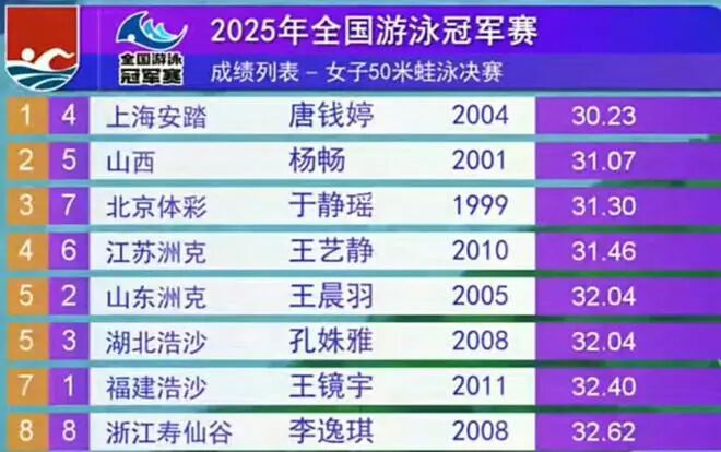 In the women's 50-meter breaststroke final, Tang Qianting clinched the gold medal with a time of 30.23 seconds, becoming the only swimmer in the entire field to meet the World Championships A-standard (30.75). Yang Chang secured the silver medal at 31.07 seconds, while Yu Jingyao took home the bronze with a time of 31.30 seconds. Notably, Tang Qianting set a new Asian record of 29.51 seconds at the 2024 Doha World Championships. The existing world record, 29.16 seconds, was set by Lithuanian star Rūta Meilutytė at the 2023 Fukuoka World Championships. During the preliminary rounds, both Tang Qianting and Yang Chang had already achieved the World Championships A-standard, and they repeated that feat again in the semifinals. According to the selection criteria, Tang Qianting has earned her spot at the World Championships, while the second berth remains undecided. Earlier in the competition, Tang Qianting consistently broke meet records in both the preliminaries and semifinals, showcasing exceptional form and confidence.