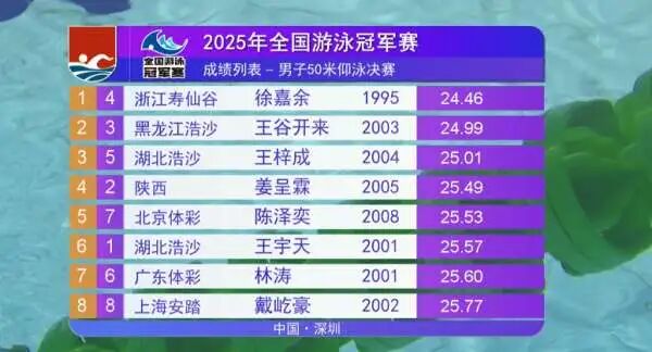 In the men's 50-meter backstroke final, Xu Jiayu clinched the gold medal with a time of 24.46 seconds, while Wang Gukai took home the silver with 24.99 seconds, and Wang Zicheng secured bronze in 25.01 seconds. All three swimmers not only claimed their respective medals but also met the World Championships A-standard time of 25.11 seconds.