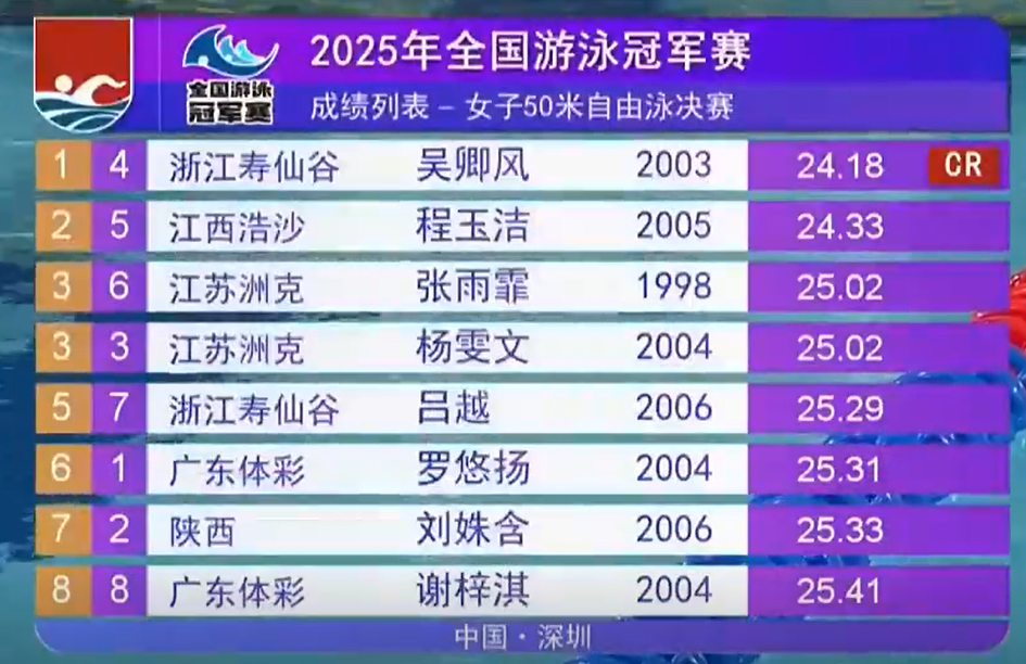 On May 24, the 8-day-long 2025 National Swimming Championships concluded at the Shenzhen Universiade Sports Center Swimming Pool, with finals held for eight events that day.