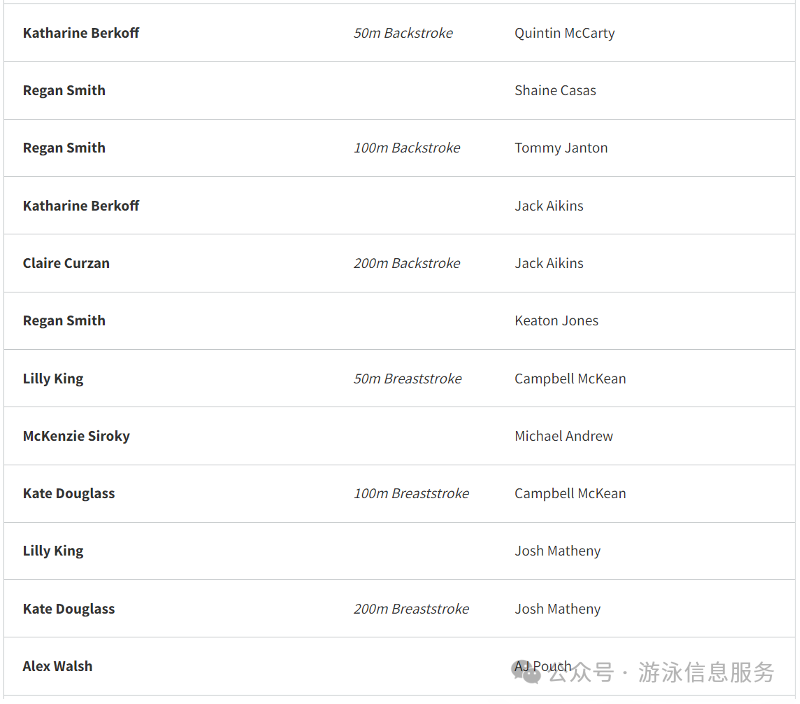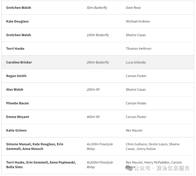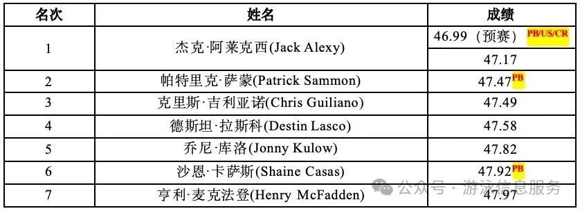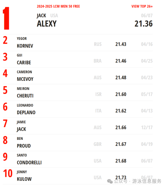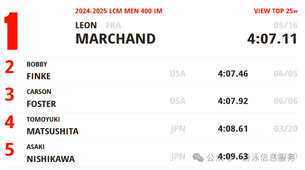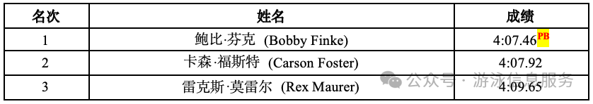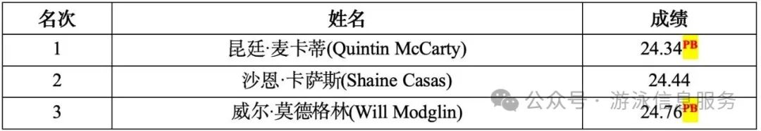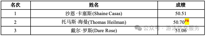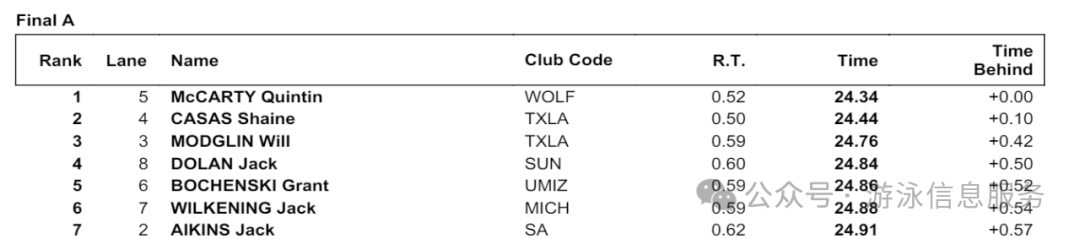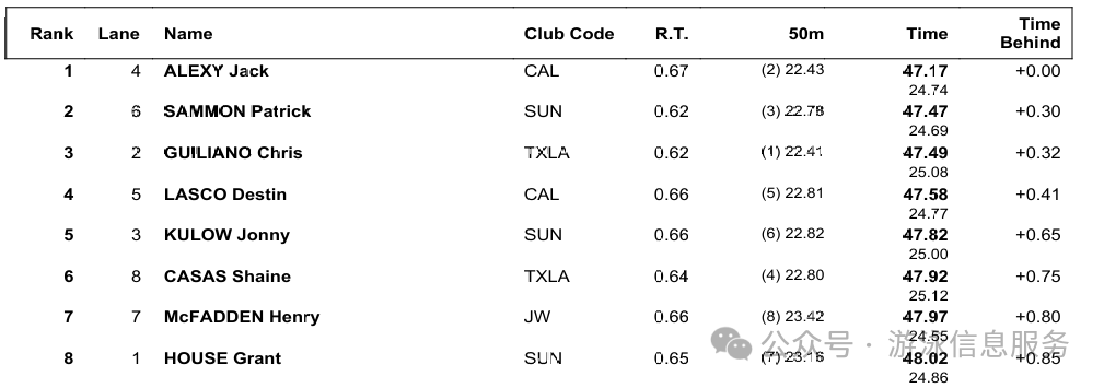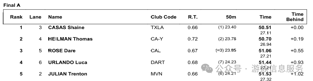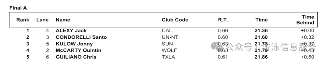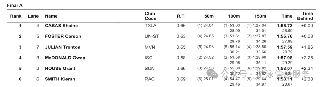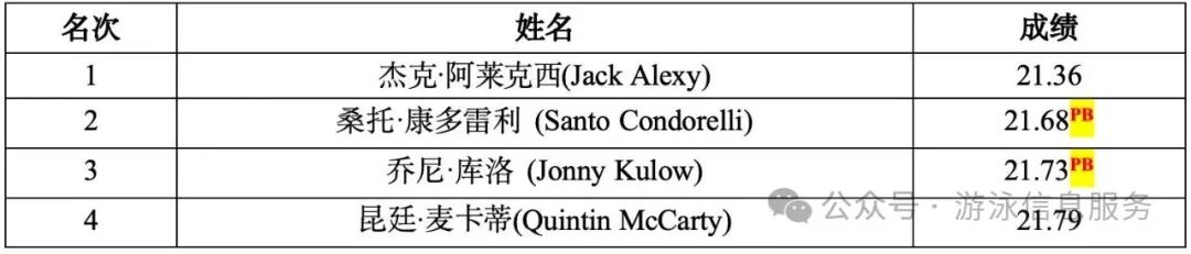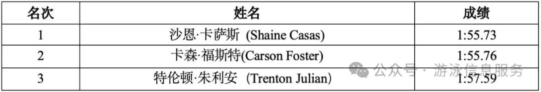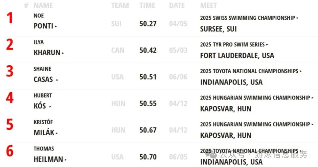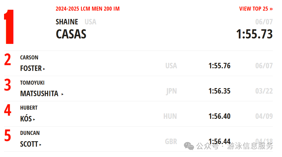 In the men's 200m individual medley final, Shaine Casas claimed victory with a time of 1:55.73, closely followed by Carson Foster, who finished second in 1:55.76. Notably, both swimmers now rank first and second, respectively, in this year's (2024-2025) world rankings. Carson Foster’s performance was just 0.11 seconds slower than his personal best set last year during the Olympic trials. Trenton Julian rounded out the podium in third place (1:57.59). All six finalists had already met the event’s World Championships ‘A’ qualifying standard of 1:59.05 prior to the final.(Quoted from Swim Swam, as of June 8)Top six finishers' split times for the men's 200m individual medleyJack Alexy claimed victory with a time of 21.36, securing the top spot in this season's (2024-2025) world rankings. Santo Condorelli delivered a personal best of 21.68, earning him a spot on the U.S. team for the 2025 World Championships in Singapore—making him the third different national athlete to represent Team USA, after previously competing for Canada and Italy. His previous personal best of 21.83 was set at the Rio de Janeiro Olympics while representing Canada. Jonny Kulow followed closely behind with a new personal best of 21.73, also improving his previous mark. Quintin McCarty, the 50-meter backstroke champion, finished fourth in 21.79 seconds. Notably, all five finalists met the World Championships A standard of 22.05.(Quoted from Swim Swam, as of June 8)Top five athletes' results in the men's 50-meter freestyleTranslated from the Swimming Information Service official account