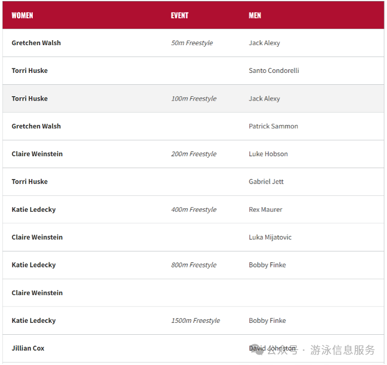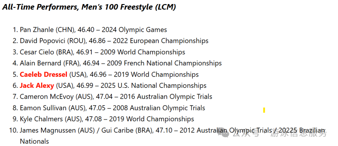 The 2025 U.S. Swimming Championships, serving as the selection trials for the 2025 World Aquatics Championships in Singapore, took place from June 3 to 7 in Indianapolis, Indiana. Swimmers who achieve a FINA World Aquatics A-standard time in their respective events and rank within the top two will qualify for the World Championships. Additionally, in the 100m and 200m freestyle events, the top four athletes will automatically earn spots on the relay teams.The following diagram shows the list of male and female athletes selected by USA Swimming for the World Championships, along with their event entries.In the morning preliminaries, Jack Alexy set a new personal best with a time of 46.99, breaking both his own meet record and the U.S. Open record in the event. His swim was just 0.03 seconds off the Americas record of 46.96, set by Caeleb Dressel in 2019. Currently, Jack ranks sixth among the world’s fastest times in the men’s 100-meter freestyle, and he sits atop the global rankings for this season (2024-2025).