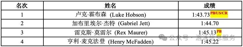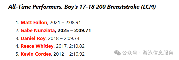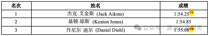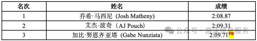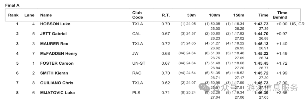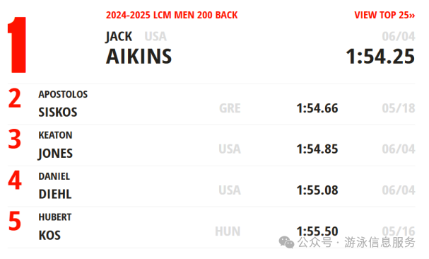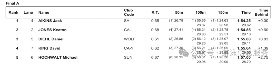 (Quoted from Swim Swam, as of June 8)Top eight finishers' split times in the men's 200m freestyleIn the 2024 Paris Olympics, swimmer Josh Matheny claimed victory with a time of 2:08.87, while AJ Pouch finished second in 2:09.31. Meanwhile, 17-year-old Gabe Nunziata made history by shaving off more than half a second from his previous best, clocking a stunning 2:09.71. This remarkable performance now ranks him second in the all-time world rankings for the 200-meter men's breaststroke among athletes aged 17 and 18. Looking ahead, Gabe is already positioning himself as a strong contender to claim the title at the 2025 World Junior Championships, alongside Japan’s Shin Ohashi. Notably, all four finalists in this event had already met the World Championships A-standard time of 2:10.32 before the final race.(Quoted from Swim Swam, as of June 8)Top four finishers' split times for the men's 200m breaststrokeJack Aikins topped the finals with a time of 1:54.25, besting his previous personal best of 1:54.78 set at the 2024 U.S. Olympic Trials, and clinched the gold medal. He now ranks No. 1 in the world this season (2024-2025) for this event. Keaton Jones, who will compete at the 2024 Paris Olympics, took home the silver medal, finishing in 1:54.85. Meanwhile, Daniel Diehl secured bronze with a time of 1:55.08, improving by a remarkable 0.96 seconds from his own personal best of 1:56.04. Notably, all five finalists met the World Championships A standard of 1:58.07.(Quoted from Swim Swam, as of June 8)Top five athletes' split times in the men's 200m backstrokeMen's 400m Individual Medley