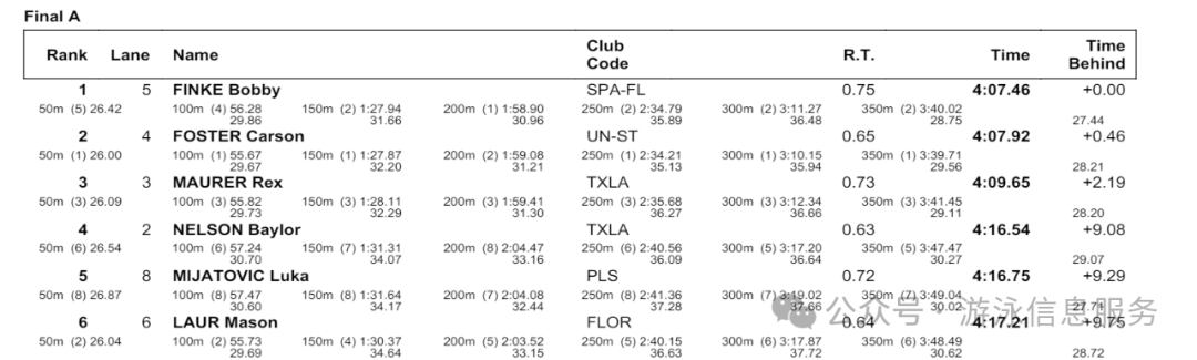 (Quoted from Swim Swam, as of June 8)Top six finishers' split times for the men's 400m individual medley