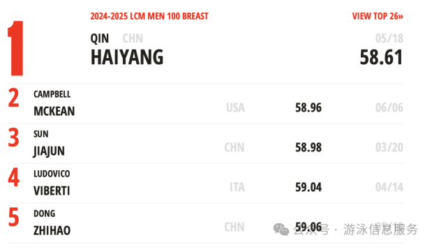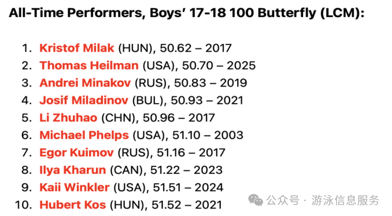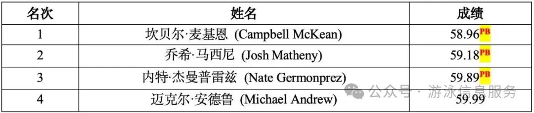 (Quoted from Swim Swam, as of June 8)(Quoted from Swim Swam, as of June 8)Top five swimmers' split times in the men's 100m butterflyMen's 50-meter breaststroke