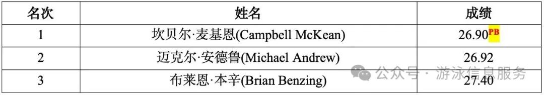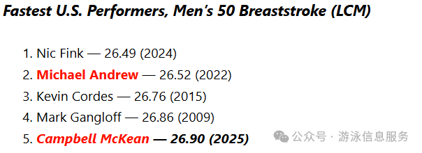 Campbell McKean edged out veteran Michael Andrew by a razor-thin margin of 0.02 seconds (26.90) to claim the gold medal, not only shaving off his personal best but also becoming the fifth-fastest American swimmer in history in this event. Michael Andrew finished second with a time of 26.92, while Brian Benzing rounded out the podium in third place at 27.40. Notably, both Campbell McKean and Michael Andrew met the A-standard qualifying time (27.33) required for the World Championships in this event.(Quoted from Swim Swam, as of June 8)Men's 50-meter backstroke