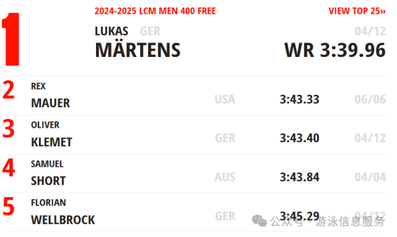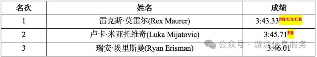 Quintin McCarty took the lead with a time of 24.34, finishing first in the race. Known on the NCAA circuit for his standout performances in short-distance freestyle events, Quintin McCarty has been steadily improving his backstroke this season—highlighted by a personal best of 24.45, which he achieved at the USA Swimming Pro Swim Series stop in Fort Lauderdale back in May. Shaine Casas claimed second place with a time of 24.44, while Will Modglin secured third with a career-best 24.76. Notably, all seven top finishers met the A-standard qualifying time (25.11) required to compete at this year’s World Championships in the event.Top seven athletes' results in the men's 50m backstrokeRex Maurer shattered the U.S. Open and meet record of 3:43.53, set by Larsen Jensen in 2008, with a time of 3:43.33. This remarkable performance marked a massive improvement for Maurer, shaving 3.19 seconds off his previous personal best—and now positions him as the third-fastest American ever in this event, behind only Larsen Jensen and Peter Vanderkaay. Additionally, his swim ranks second worldwide this season (2024-2025) in the event, just behind Lukas Märtens’ world-record time. Meanwhile, 15-year-old Luka Mijatovic finished second with a time of 3:45.71, breaking his own U.S. age-group record (for 15-16 year-olds) set earlier in the preliminaries. Ryan Erisman rounded out the podium in third place, clocking in at 3:46.01—a feat that not only earned him the win but also broke Larsen Jensen’s more than two-decade-old U.S. men’s 17-18 age-group record.(Quoted from Swim Swam, as of June 8)Men's 100-meter breaststroke