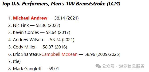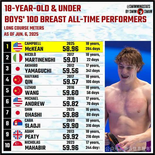 Campbell McKean made history at this competition by becoming the first swimmer to break the 1-minute mark, clocking a time of 58.96—shattering Michael Andrew's previous U.S. record for the 17-18 age group (59.82). McKean now ranks as the second-fastest performer in this event for the 2024-2025 season and ties for sixth fastest in U.S. history across all age groups. Notably, he also set the fastest-ever time in the 18-and-under category for this event.
