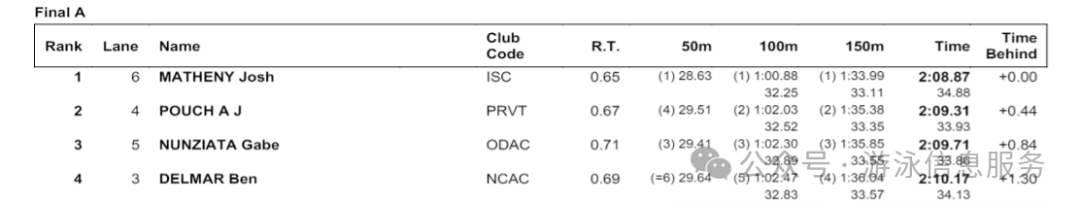 (Quoted from Swim Swam, as of June 8)(Quoted from Swim Swam, as of June 8)(Quoted from Swim Swam, as of June 8)Men's 200m Individual Medley