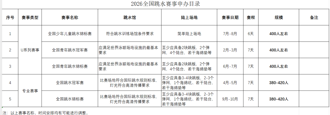 According to the 2026 National Diving Event Schedule, and in order to further enhance the organization and preparation for diving competitions at all levels across the country, we are now publicly inviting applications from potential hosts for the 2026 National Diving Events. Details are as follows:
