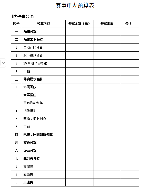 4. The Swimming Administration Center of the General Administration of Sport will organize experts to conduct a comprehensive review of organizations that meet the criteria for hosting the event. The review will cover, but is not limited to, factors such as government support, budget details, the applicant organization’s event-hosting experience, venue facilities, hotel availability, and the host city itself.