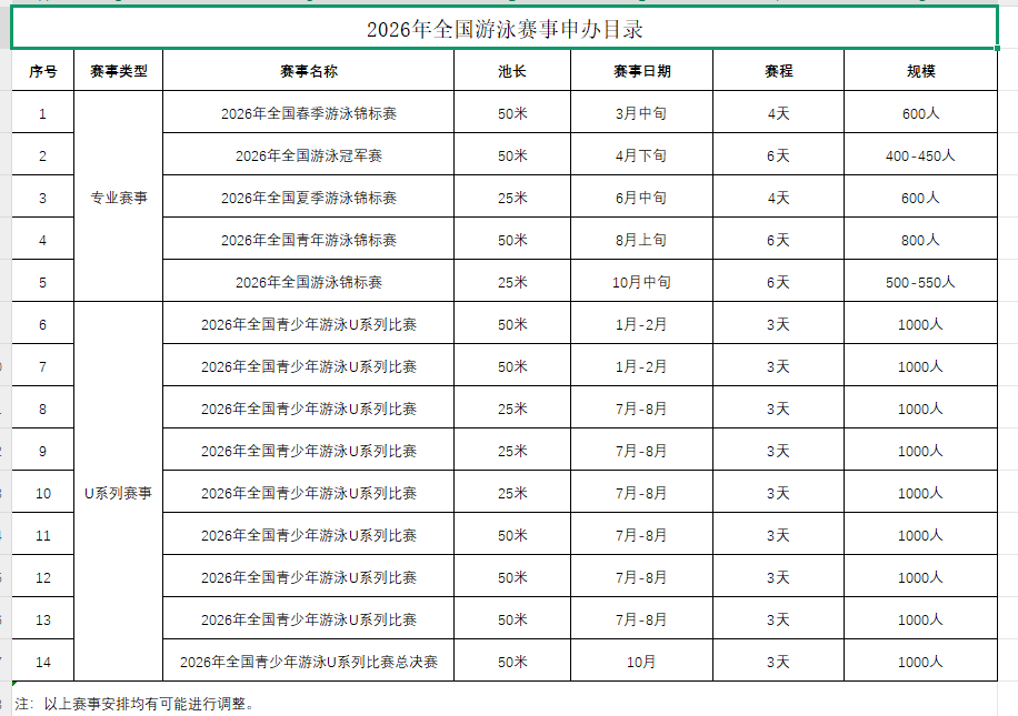 (1) The 2026 National Swimming Events Bid Catalogue may be adjusted based on actual circumstances, with details subject to notification from our center.