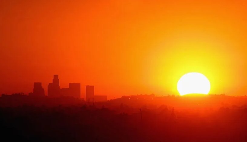 The Los Angeles city skyline at sunset