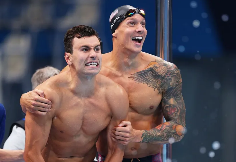 In the men's 4x100m freestyle relay final at the 2020 Tokyo Olympics, Team USA's Caeleb Dressel and Blake Pieroni celebrated winning the gold medal.