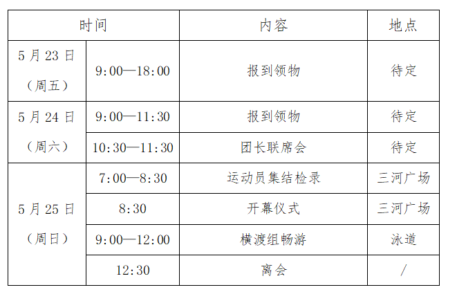 The water flow in the activity area is slow, centered around the main channel, with water temperatures typically around 20°C at this time of year.6. Delegation Composition Method1. All member organizations of the Chinese Swimming Association, as well as national adult swimming clubs, swimming associations, winter swimming associations, and other sports-oriented swimming-related social groups across the country;2. Each delegation shall have one head and one liaison officer;3. Number of delegates per delegation: In principle, no fewer than 5 people (gender unspecified);4. Each delegation should be accompanied by a team doctor, who may also serve as an event participant.