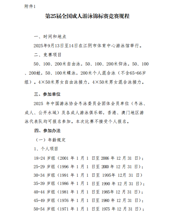 To fully implement the General Administration of Sport's guiding principles on strengthening nationwide fitness activities and further promote the widespread participation in swimming among the general public in China, the 25th National Adult Swimming Championships will be held from September 13 to 14 at the Jiangyin City Sports Center Swimming Pool. The event is organized under the guidance of the Mass Sports Department of the General Administration of Sport of China, hosted by the Swimming Sports Management Center of the General Administration of Sport and the Chinese Swimming Association, and co-organized by the Jiangyin Municipal Bureau of Culture, Radio, Television, and Tourism, along with Jiangyin Cultural, Commercial, and Tourism Industry Group Co., Ltd. Jiangyin Jiyang Sports Industry Co., Ltd. will also provide support for the event. Detailed arrangements are outlined below: