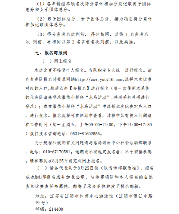 For inquiries regarding regulations and rules, please contact the Social Activities Department of the General Administration Swimming Center at 010-67170581. Participants who fail to register by the deadline or do not follow the specified registration procedures will not be scheduled to compete. Please ensure that all participating teams complete their online registration by August 25.