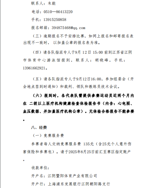 (1) Please have each team assign a designated representative to complete the registration procedures at the Jiangyin City Sports Center Swimming Pool by 3:00 PM on September 12.