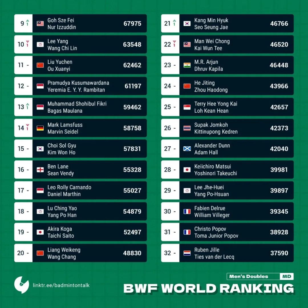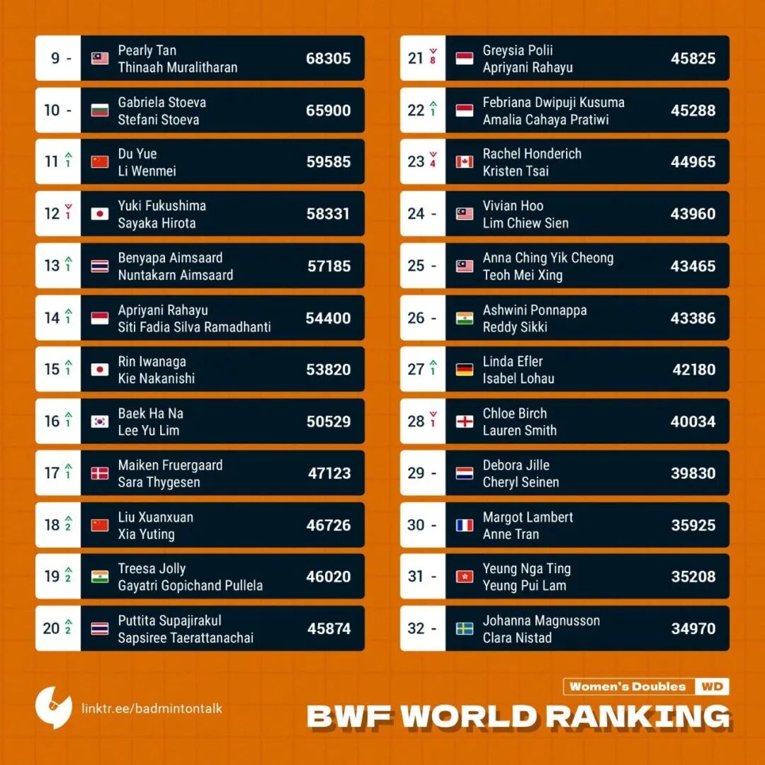 In the women's doubles eventChen Qingchen/Jia Yifan remain firmly at the top of the rankings, while Zhang Shuxian/Zheng Yu climb one spot to seventh place, Du Yue/Li Wenmei move up one position to 11th, and Liu Xuanxuan/Xia Yuting jump two spots to 18th.