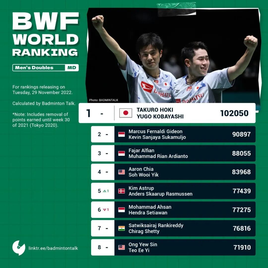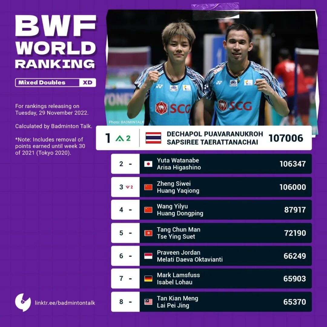 On November 29, 2022, the Badminton World Federation released the latest world rankings, revealing ongoing shifts across all five disciplines as points continue to be unlocked. The most significant change occurred in the mixed doubles event, where Thailand's Dechapol/Pitchyao reclaimed the top spot, claiming the new world No. 1 ranking. Meanwhile, China’s dominant men’s doubles duo Zheng Siwei/Huang Yaqiong dropped to third place after losing points earned from their silver-medal performance at the Tokyo Olympics. Among all five disciplines, only China’s women’s doubles pair remains firmly at the summit of the rankings.