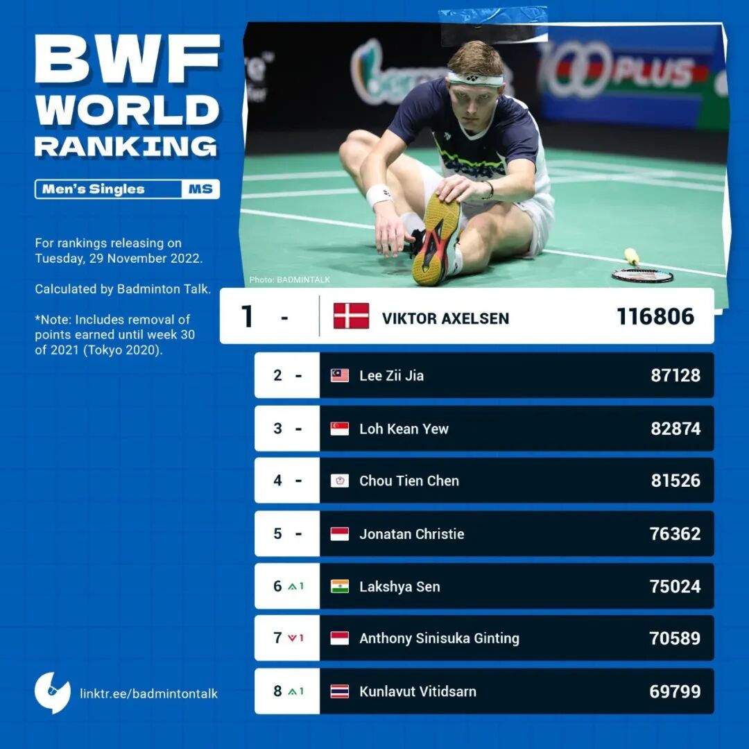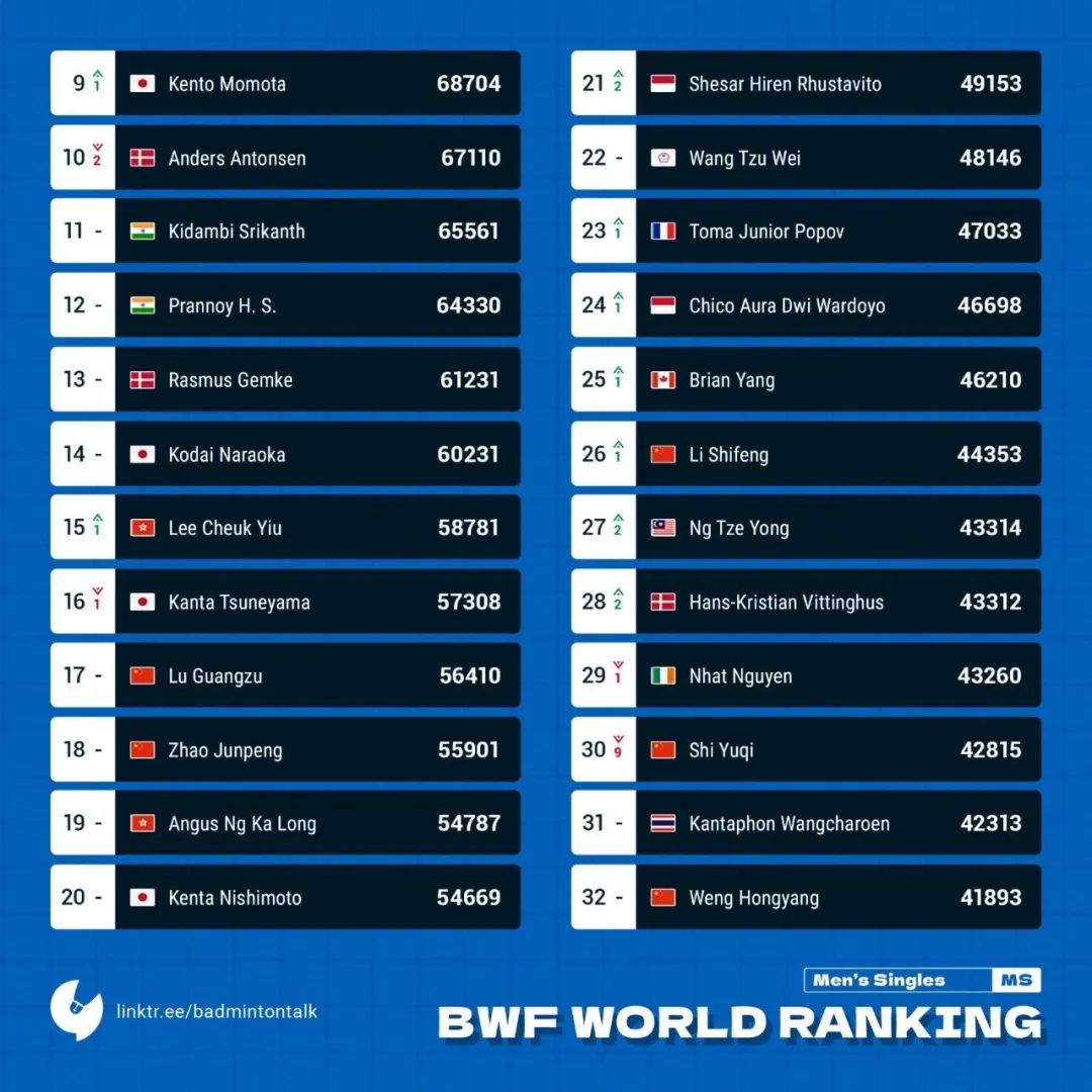 In the men's singles eventThe Chinese badminton team's five players all ranked within the top 32, meaning they’ll all be able to compete at next January’s Malaysia Open. Among them, Lu Guangzu is No. 17, Zhao Junpeng No. 18, Li Shifeng No. 26, Shi Yuqi No. 30, and Weng Hongyang No. 32. Meanwhile, in the men’s singles top 10 rankings, the top five remain unchanged: Antonsen, Lee Zii Jia, Loh Kean Yew, Chou Tien Chen, and Jonatan sit in the first five spots. Lakshya Sen has moved up to sixth place, surpassing Anders Antonsen, while Kunlavut Vitidsarn and Kento Momota are seventh and eighth, respectively, with Viktor Axelsen dropping to tenth.