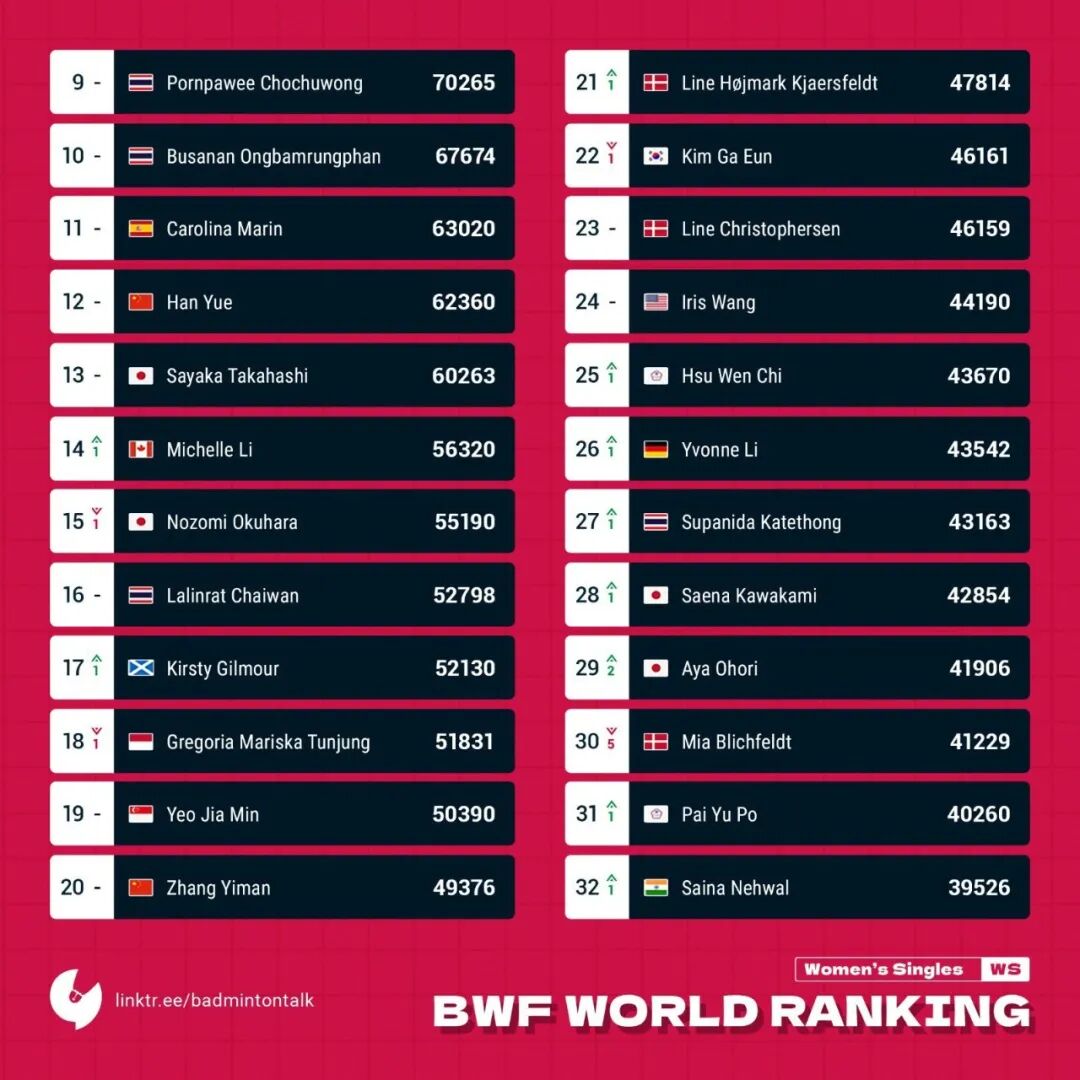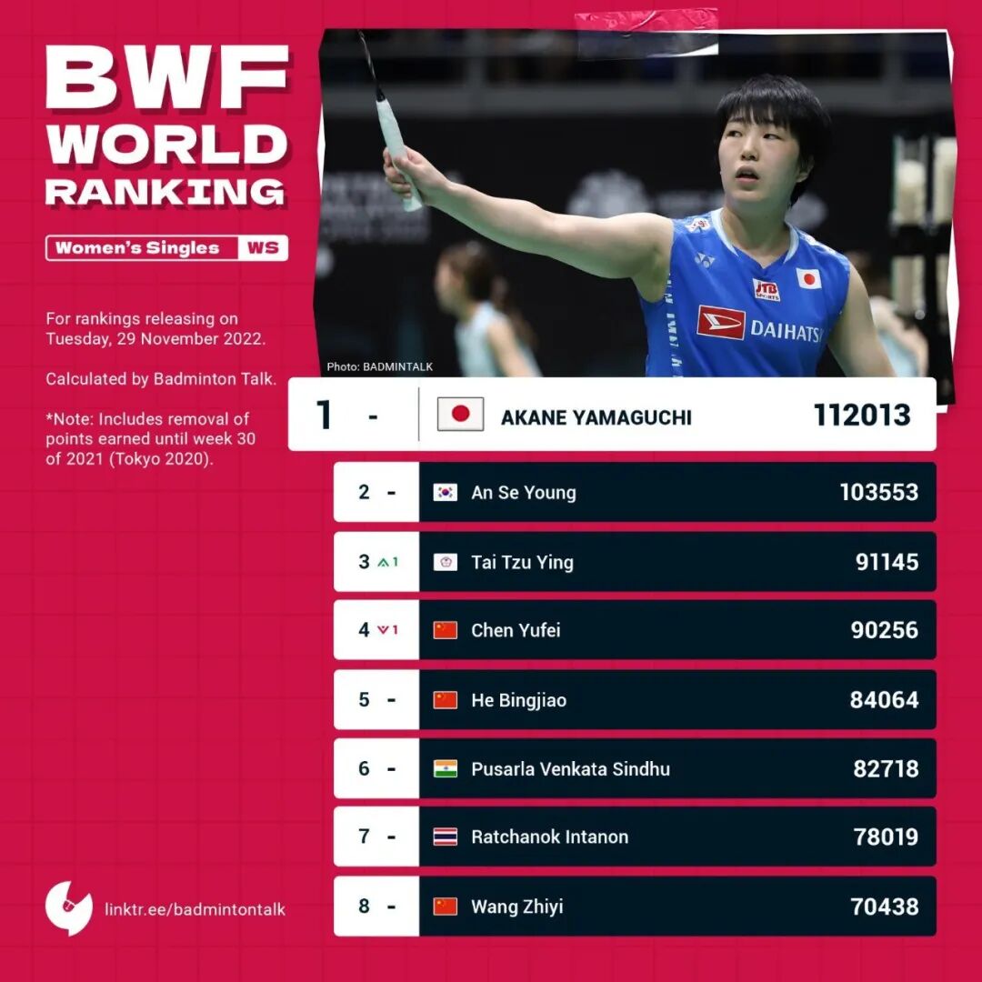 On the women's singles frontChen Yufei has dropped to fourth place in the rankings after losing her Tokyo Olympics title points, allowing Chinese Taipei's top player Tai Tzu-ying to surpass her and reclaim the No. 1 spot. Meanwhile, Akane Yamaguchi and An Se-young remain firmly at Nos. 1 and 2, respectively. He Bingjiao continues to hold fifth position, Wang Zhiyi is eighth, Han Yue sits at No. 12, Zhang Yiman ranks 20th, and Gao Fangjie occupies 122nd place.