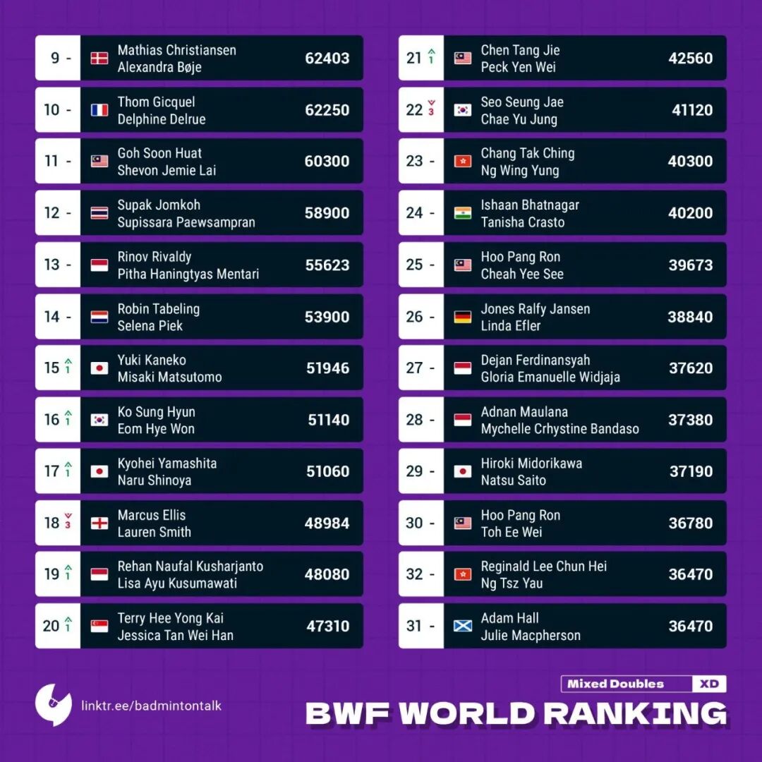In mixed doublesSignificant changes have occurred: The IELTS duo Zheng Siwei/Huang Yaqiong were docked substantial points, allowing their competitors to surpass them in the rankings. As a result, Thailand's Dechapol/Sapsiree have moved straight back to the top spot, reclaiming the world No. 1 position after dropping to third earlier. Meanwhile, Japan’s double-headed team Watanabe Yuta/Higashino Arisa remain at No. 2, while the IELTS pair has slipped to third. The "Yellow Duck" duo Wang Yilyu/Huang Dongping continue in fourth place. Notably, Guo Xinwa/Zhang Shuxian dropped one spot to No. 43, and Feng Yanzhe/Huang Dongping stay put at No. 53.