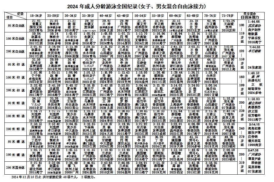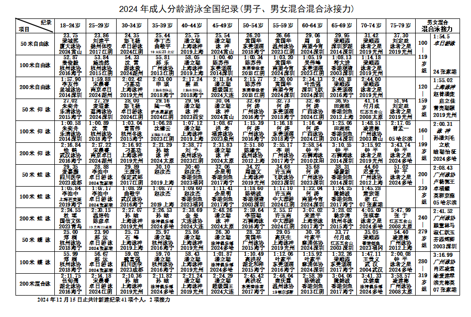 The 2024 national adult swimming competitions have all concluded smoothly as scheduled. Based on the results from these national events and the World Aquatics Masters Championships, the national records for each age group in China's adult swimming program have been updated and compiled. We now present:National record for the adult swimming event announced(Due date: December 15, 2024).