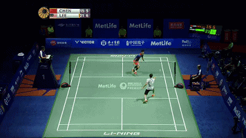 ▲ Chen Long awkwardly lunged and landed right on Lee Chong Wei's racket!