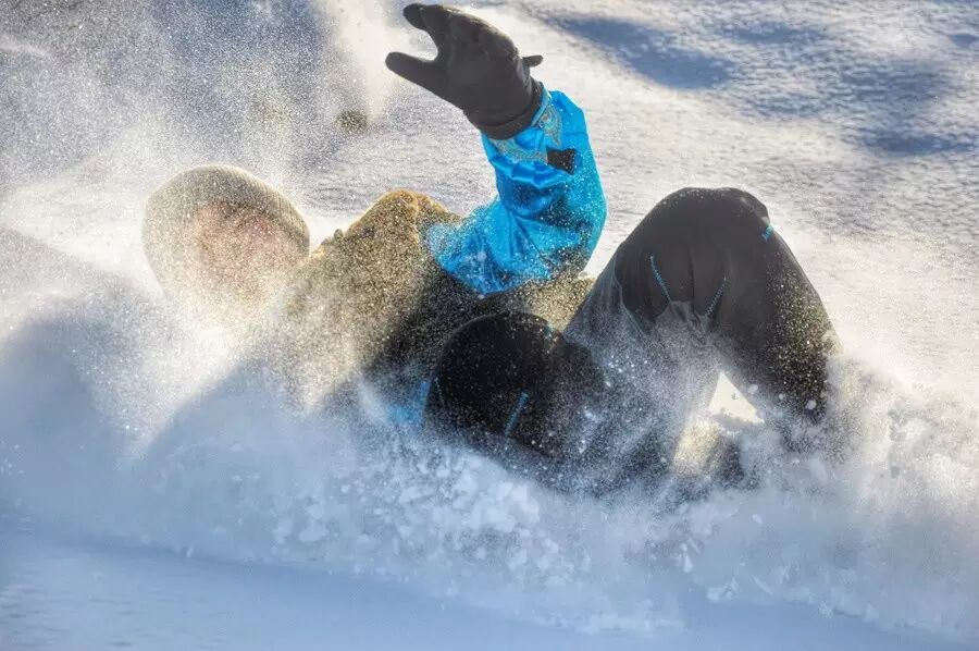 4. After landing on your buttocks, the steel edges of the snowboard will also scrape against the snow, creating resistance that helps bring the snowboard to a stop.