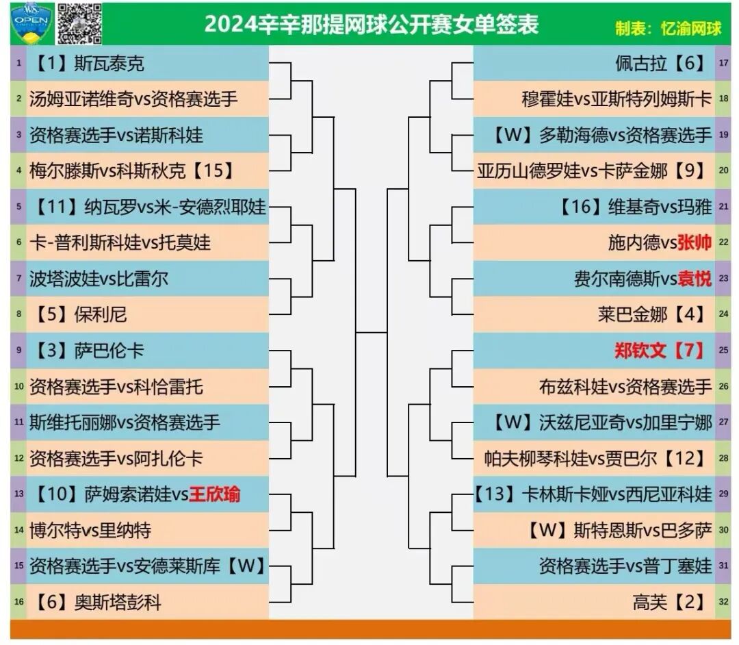 Apart from Zheng Qinwen, who entered the main draw as the No. 7 seed, Chinese players Wang Xinyu, Yuan Yue, and Zhang Shuai also successfully secured their spots in the main draw bracket. Wang Xinyu’s first-round opponent is Samsonova, Yuan Yue will face Fernandez in her opening match, while Zhang Shuai’s opponent is the recently red-hot Schnur—making her path to advancement look particularly challenging.