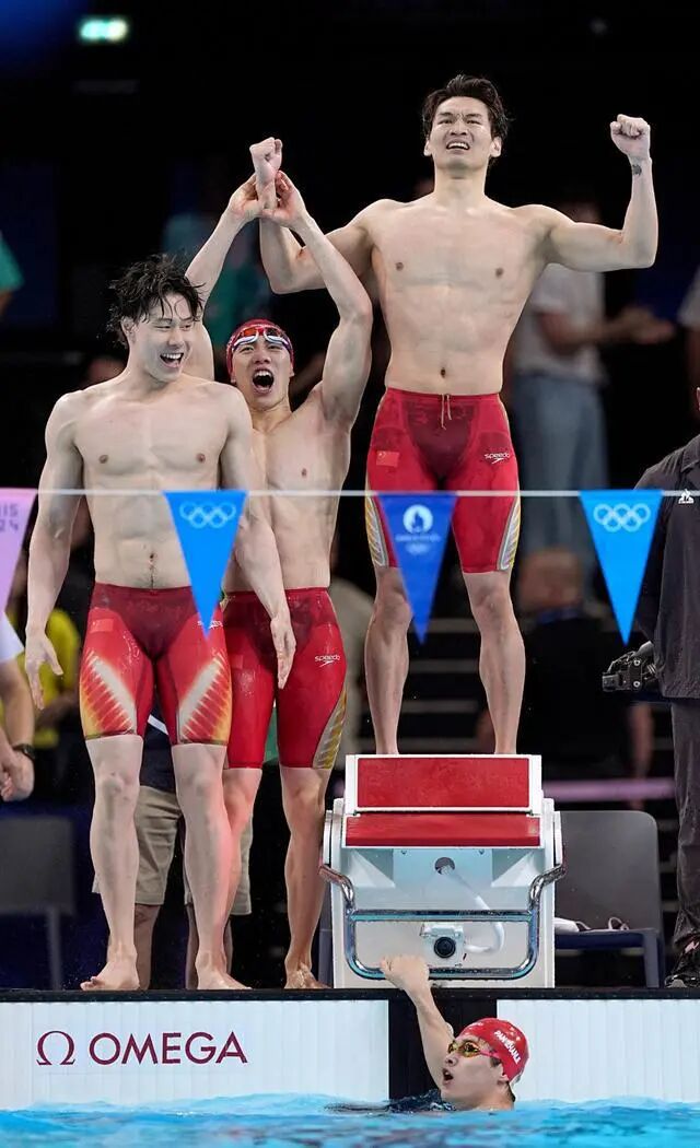 On August 4, 2024, in the men's 4x100m medley relay final at the Paris Olympics, China clinched the gold medal with a time of 3:27.46. Pictured here are Chinese athletes Xu JiaYu (top right), Qin Haiyang (top left), Sun Jiajun (top center), and Pan Zhanle celebrating after the race. Photo by Xinhua News Agency reporter Du Yu.