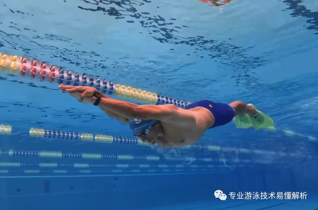 It’s clear that the arm doesn’t push backward from the very center of the body—but instead, it stays positioned at the sides, much like oars placed on either side of a boat. If, when pushing through the water, your palm faces directly toward the water, it’s as if the blade of the oar is squarely aimed at the water. In this case, the boat would veer off to the opposite side as it moves forward. That’s why swimmers must constantly alternate strokes left and right to correct their course. The same principle applies here: Is your palm really facing the water head-on, slightly angled toward your body, or deliberately turned outward? You’ll only truly understand the technique once you’ve actually swum it yourself.