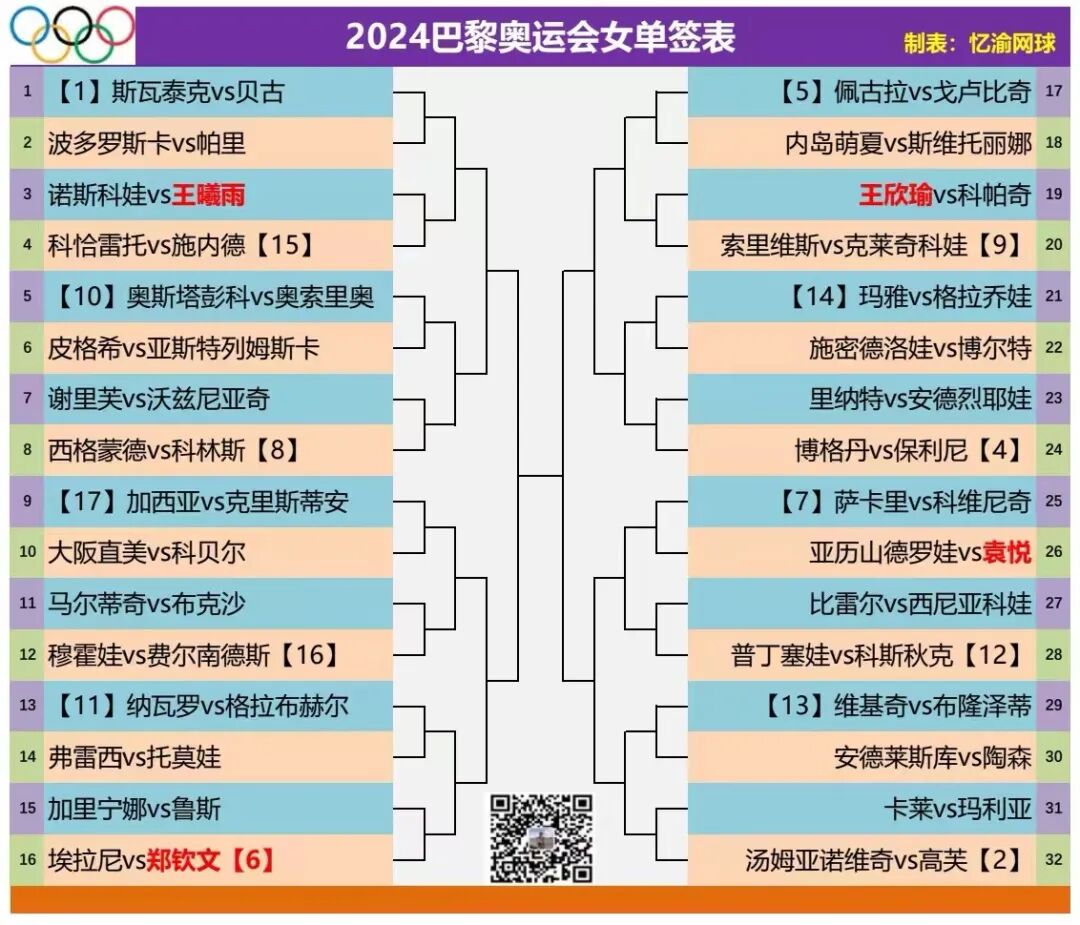 China’s women’s tennis team has four players competing in the singles event: Zheng Qinwen, Wang Xiyu, Wang Xinyu, and Yuan Yue. As the No. 6 seed, Zheng Qinwen is placed in a relatively favorable position on the draw. After several lineup changes, her first-round opponent has finally been confirmed as Italian veteran Errani. Other potential opponents include Navarro and Garcia, among others.