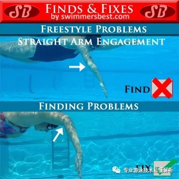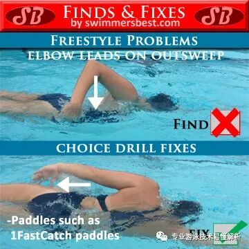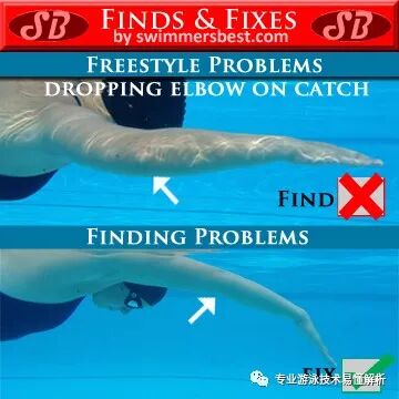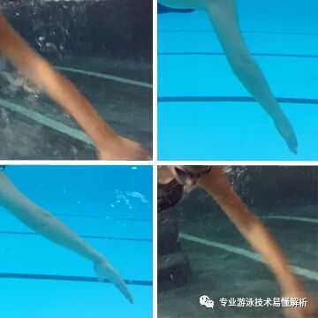 Question 6: Keeping the elbow tucked in while scooping waterAnalysis: Many swimmers focus heavily on pushing the water, pulling the arm through the water, and entering the water, but often pay insufficient attention to the "catch" phase—particularly the transition from the forward reach to the catch itself. This is a critical stage where swimmers tend to inadvertently push the water downward with their entire arms.Correction: After the arm enters the water, extend it fully and keep it parallel to the water’s surface. When you initiate the catch phase, remember to stabilize your elbow joint—lead with your forearm as you press downward into the water, followed by your wrist joint, which should turn downward ahead of the forearm. Finally, your palm presses firmly against the water.