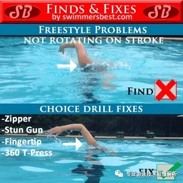 Question 8: Insufficient range of lateral body rotationAnalysis: The body's lateral rotation isn’t just about ensuring a smooth arm recovery—it’s a crucial movement that integrates the forces generated during freestyle swimming. By rotating laterally, the lower body’s kicking action and the upper body’s arm strokes can work together more effectively, creating a harmonious, coordinated motion that propels the swimmer forward with maximum efficiency.Correction: If you feel tension in your back as your arm recovers, it means your body rotation is too limited, leading to improper arm recovery. On the other hand, when your forearm naturally relaxes and drops slightly as your arm exits the water during recovery, with your fingers remaining just above the surface and gliding smoothly across it, this indicates that your body rotation is sufficient.