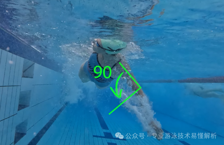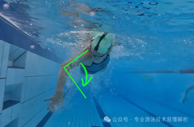 Hugging the water is like fully submerging the paddle blade in water while rowing—think of it as scooping water with the curve of your arm during freestyle. If the angle between your upper and lower arms becomes too wide, you’ll inevitably lose grip on the water. Moreover, throughout the push phase, it’s crucial to maintain that "hugging" sensation. Some swimmers may execute a solid catch-and-hold motion, but when they widen their arm bend during the push, all the water they’ve gathered simply slips away. As a result, only the palm remains effectively catching the water, making it impossible to swim efficiently or quickly.