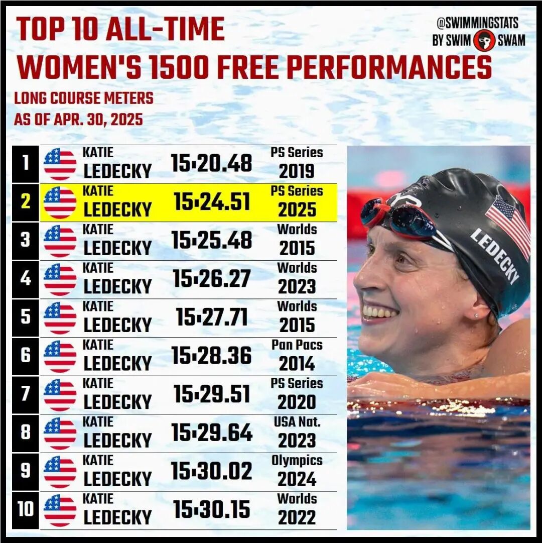 In Fort Lauderdale, everything seemed to be already foreshadowing. Early on May 1st, Beijing time, Ledecky achieved…15:24.51, second fastest in historyShe clinched the championship with a performance that narrowly missed her own world record set seven years ago—truly a remarkable start.
