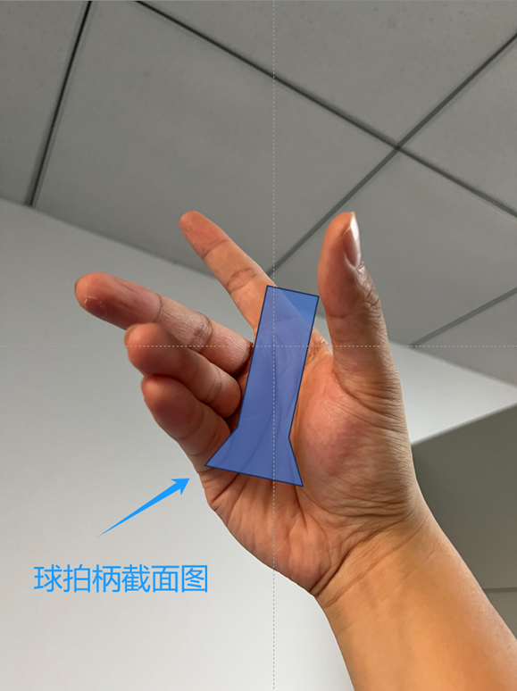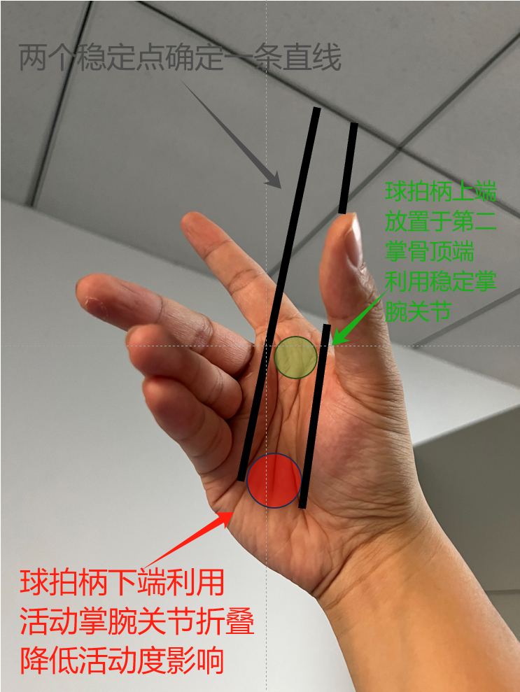 As shown in the diagram above, the second and third carpometacarpal joints provide stable structures, with the second carpometacarpal joint being the most stable. In contrast, the first, fourth, and fifth joints offer greater mobility. When generating force actively, players must leverage the stability of the second and third carpometacarpal joints to maintain overall hand stability, while simultaneously minimizing the impact of increased mobility in the other wrist joints on the structure. Specifically, this is achieved by placing the upper end of the racket handle atop the most stable second metacarpal bone (at the base of the index finger), then using muscular strength to flex the first, fourth, and fifth carpometacarpal joints, effectively locking the bottom of the handle into position—typically between the so-called thumb carpometacarpal joint and the fourth/fifth carpometacarpal joints. The precise technique is illustrated in the figure below.
